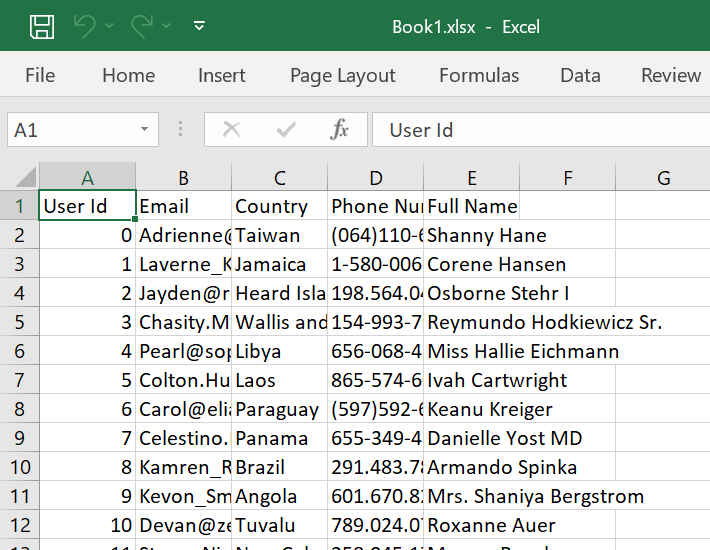 First I have workbook Book1 with some data (randomly generated by DatabaseTestData.com).