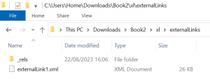 I changed the file extension of Book2 from XLSX to ZIP and unpack the file to see what’s inside. There is a subfolder there under xl\externalLinks\ and this is where Excel stores the data of the external reference. There will be 1 or more files named externalLink*.xml, in which * is the number of external references of the workbook.